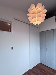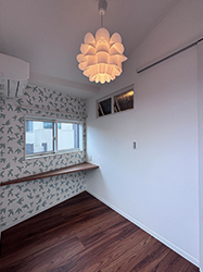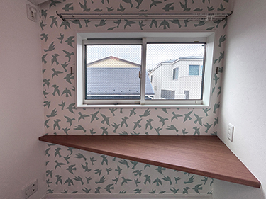 3つ目のお部屋は、鳥の柄クロスが印象的なナチュラルテイストの空間。 隣室とゆるやかにつながる室内窓や、変形型のカウンターが さりげないアクセントになっています。 それぞれにお子様達が自分で選んだ内装で、 自分だけの特別な居場所になりました。
